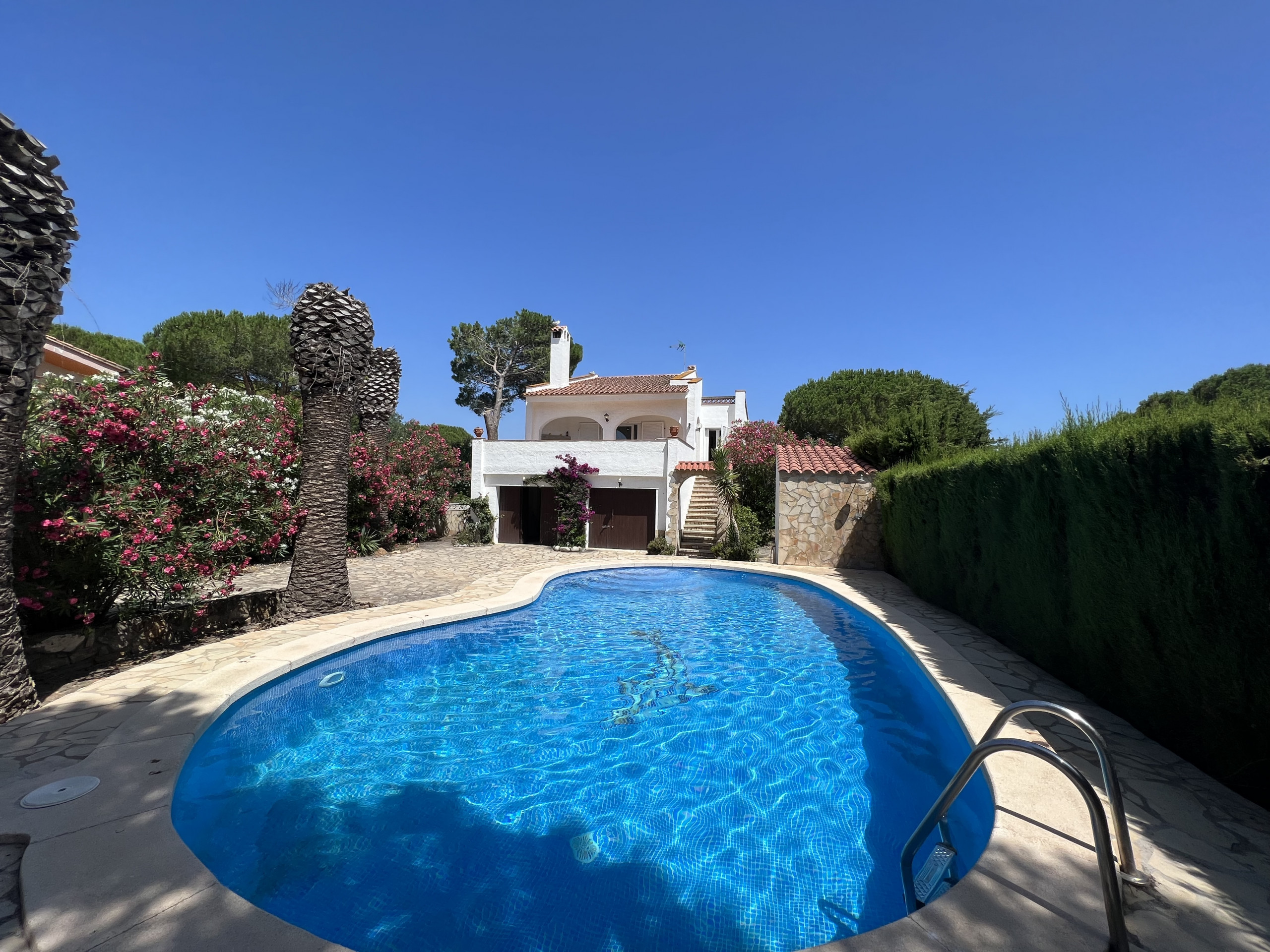 Das Chalet in Mas Pinell( Torroella de Montgri) hat ein privaten Garten mit privatem Pool und verfügt über 3 Schlafzimmer.Die komfortable und geräumige Unterkunft hat 242 M² bebaute Flächer und verfügt über eine tolle Aussicht auf den Garten und den Pool.Dieses freistehendes Haus befindet sich 350 M vom Sandstrand "Playa Mas Pinell" in einer idealen Umgebung für Familien.Die Unterkunft verfügt über einen Garten mit Möbel, eine teilüberdachte große Terrasse mit Grillplatz (Außenkamin), eine weitere Hochterrasse und einen Privatpool von ca. 40 M2 mit separatem Poolhaus ca. 6 m2 für Technik usw. sowie eine Poolterrasse. Highlight des individuellen geformten gefliesten Pools ist ein großer gefliester Delfin. ( Pool hat 40,65 m2, Technik Poolhaus 6 m2). Das Haus hat eine große Doppelgarage für 2 Autos. Zusätzlich können weitere Fahrzeuge in den Einfahrt abgestellt werden. Im Haus befindet sich ein Fernseher mit Satelliten Empfang und spanischer Antenne.Durch den mit Holz beheizbaren Innenkamin gibt es zusätzliche Wärme sorgenDie Offene Küche mit Gas-Kochfeld ist ausgestattet mit eine Mikrowelle, ein Backofen, Gefrierschrank, eine Geschirrspülmaschine und eine Waschmaschine.Hinweis: 1Badezimmer, unten Badewanne mit Dusche, Bidet, …1 Badezimmer oben direkt neben dem Schlafzimmer mit Sitzwanne inkl. Dusche….Im Erdgeschoss ist ein sehr großer Keller Abstellraum wo man noch eine extra Wohnug machen kann.Kommen Sie das Haus besuchen!"Playa Mas Pinell" entfernt, 1 km vom "vario Gola de Ter", 5 km vom Golfplatz "emporda Golf", 6 km vom Supermarkt "Raul Girona C31", 7 km von der Stadt "Torroella de Montgri", 10 km von der Bushaltestelle "Renfe Torroella de Montgri", 12 km vom Kiesstrand "Sa Tuna", 38 km vom Bahnhof "Sarfa Flaça", 56 km vom Flughafen "Girona", 105 km von von der Skistation "Setcases",