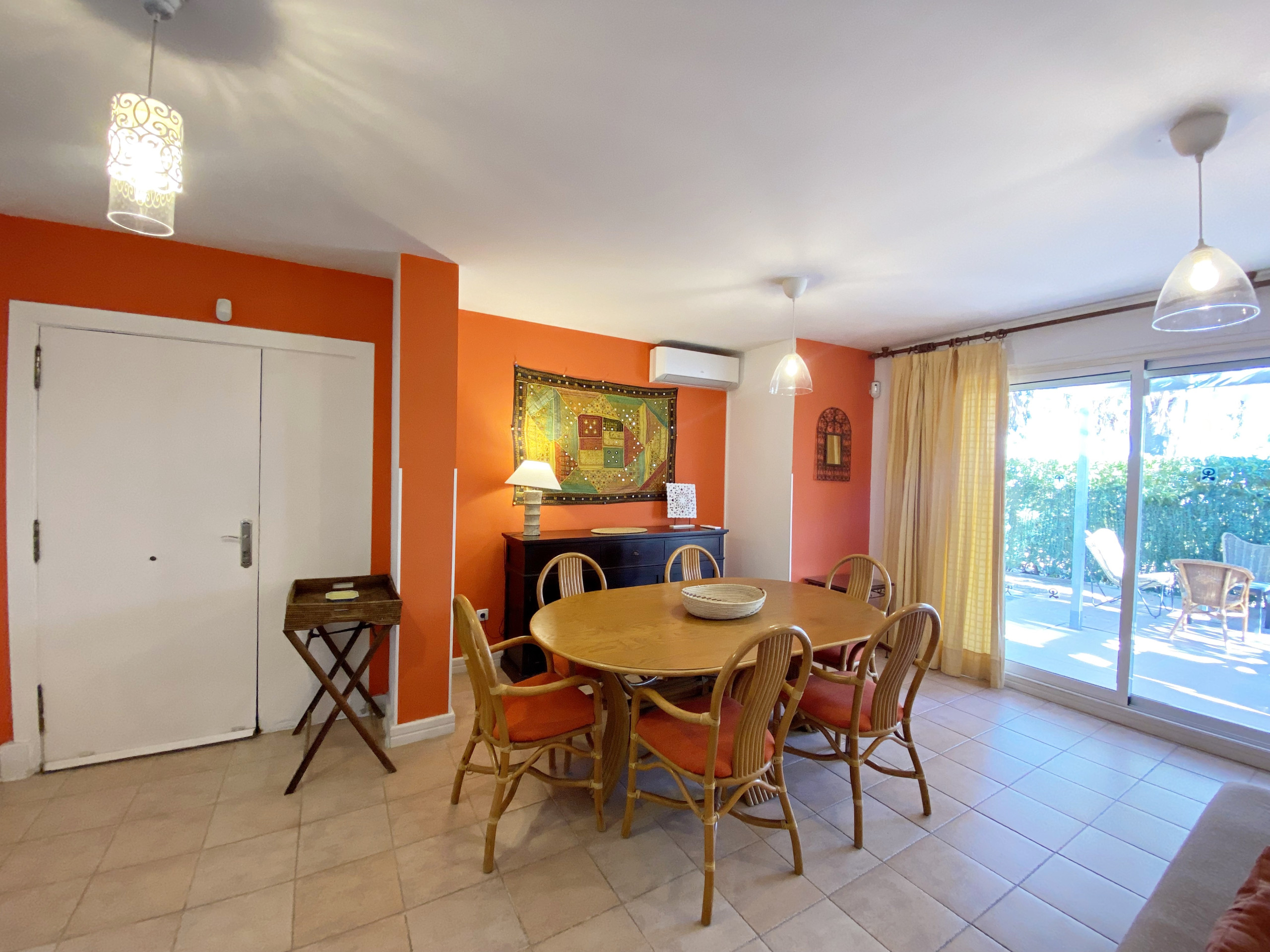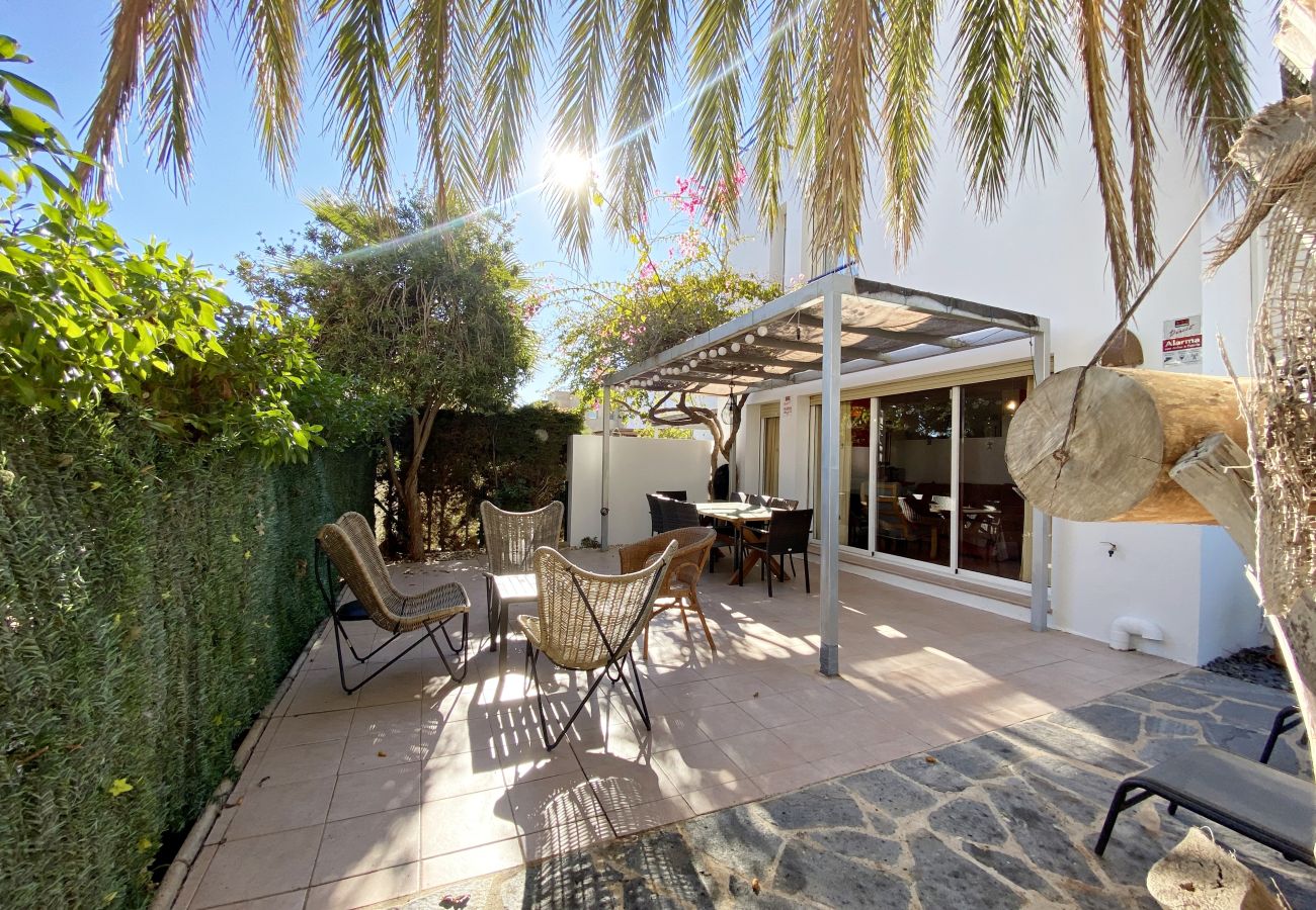 Reserva tus vacaciones en esta casa adosada, ubicada en una urbanización en primera línea de playa con piscina comunitaria. Es el lugar ideal para disfrutar con tu familia, ya que te ofrece todas las comodidades necesarias para una estancia confortable, como una terraza con vistas al mar, un amplio jardín, acondicionado aire/calefacción en el salón-comedor y en el dormitorio principal, y parking privado dentro de la urbanización. Además, ¡se admiten mascotas!. Hay ofertas especiales para largas estancias en temporada baja.