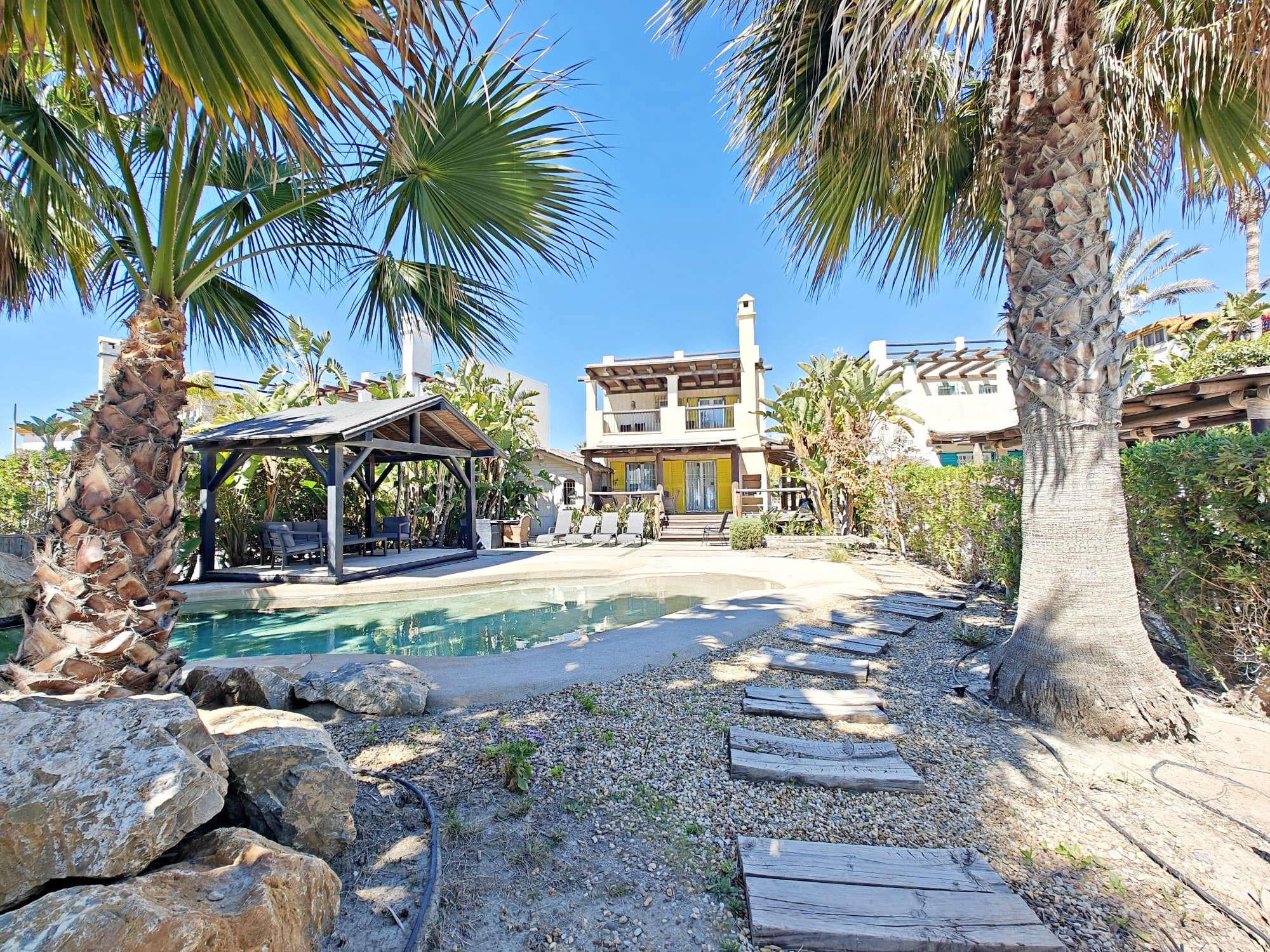Estupendo chalé de lujo en primera línea de playa con piscina privada, en El Playazo de Vera. Consta de 3 dormitorios y capacidad para 6 personas ampliable hasta 8-9 personas (bajo petición). Acceso directo a la playa desde la misma parcela mediante una puerta.