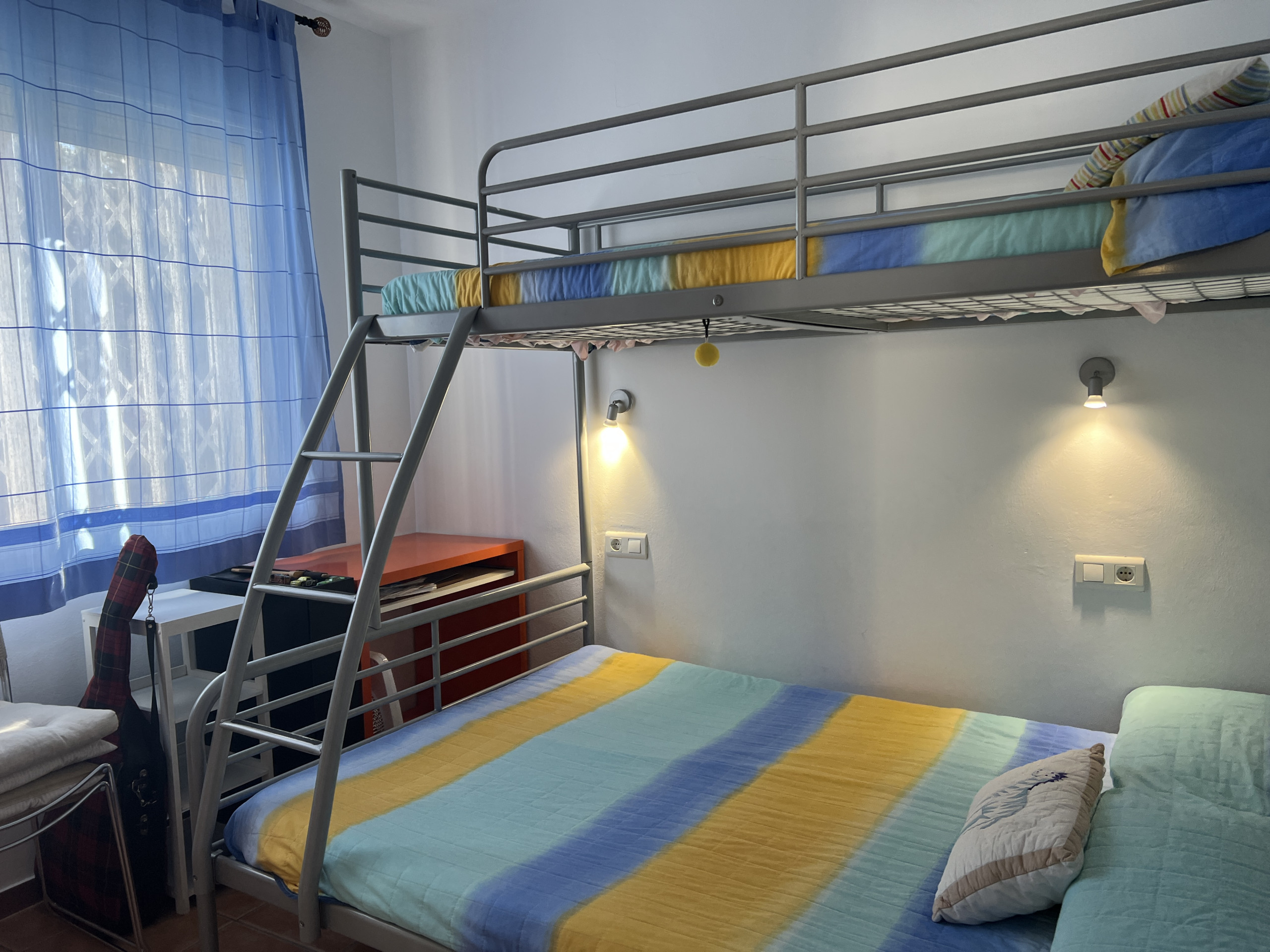 La distribución en una sola planta facilita el día a día, y sus dos acogedoras habitaciones, una infantil con litera para tres niños y otra de matrimonio ambas con armarios empotrados, garantizan el confort de toda la familia. El salón, con su cálida chimenea, se convierte en el lugar perfecto para relajarse, mientras que el comedor, equipado con ventilador de techo, ofrece un ambiente fresco y agradable.