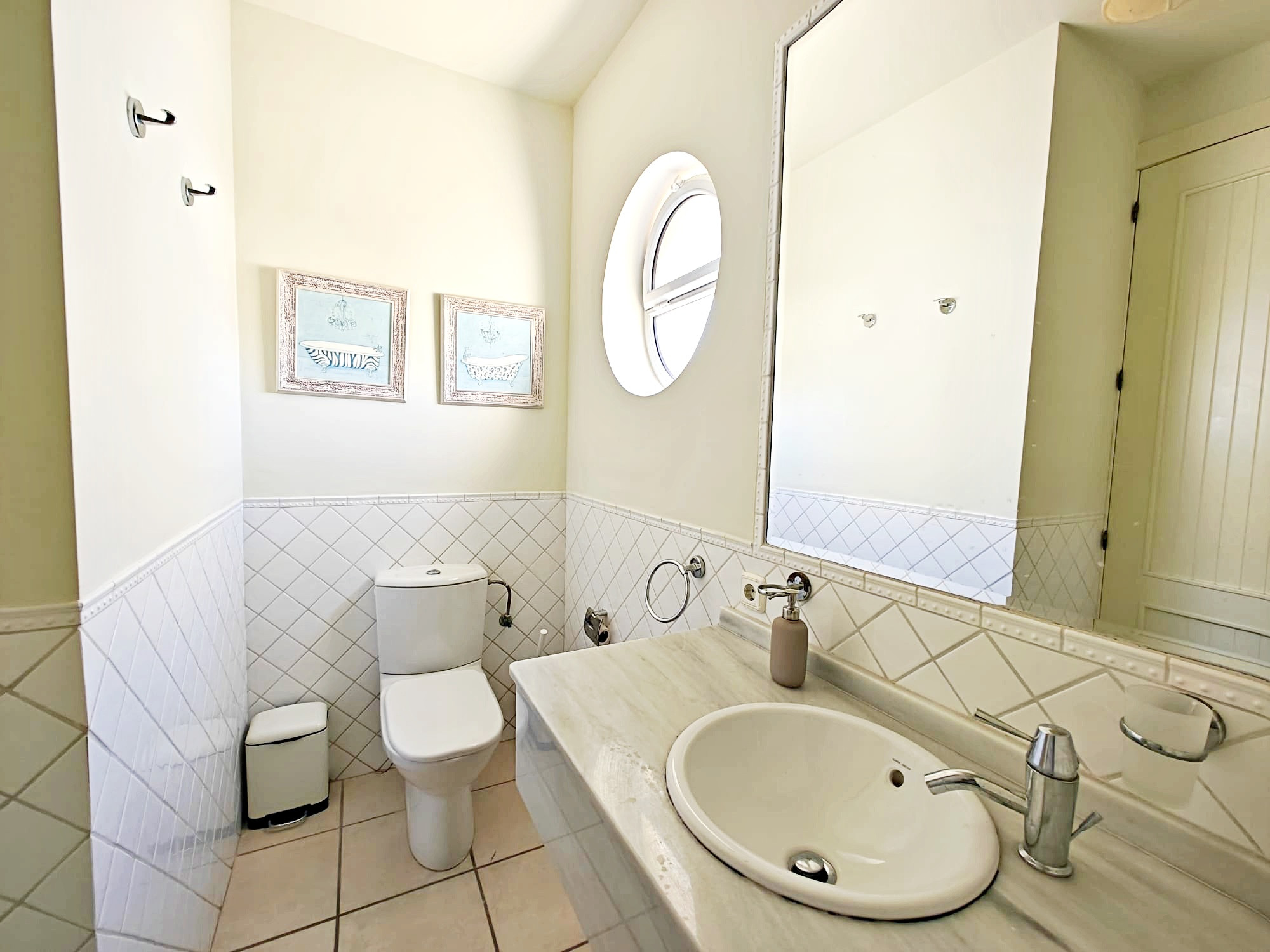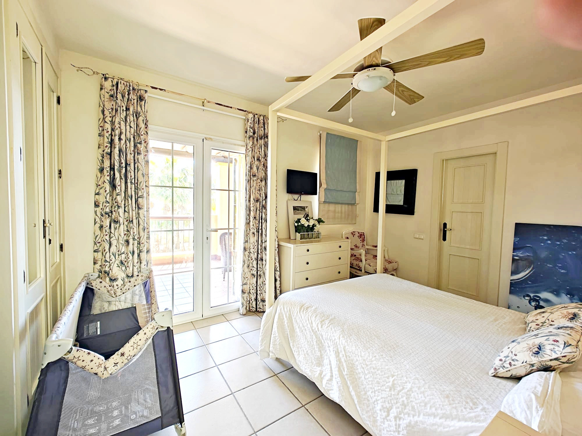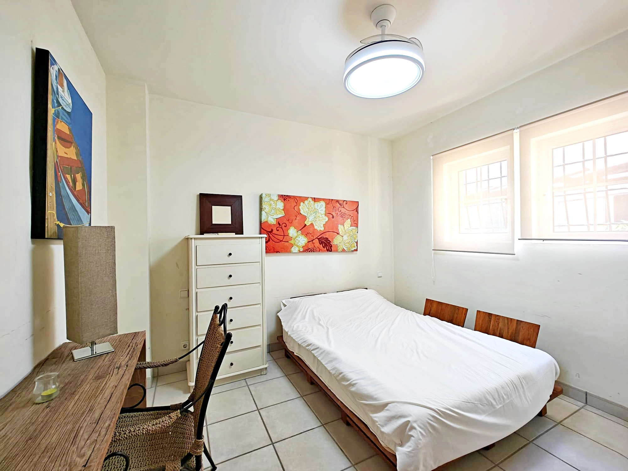 Réz- de- chaussée: une chambre avec lits superposés, salle de bains avec douche, cuisine entièrement équipée avec lave-vaisselle, lave-linge ..., salon spacieux avec des canapés confortables et télévision (espagnole). Décoration exquise, avec mobilière de qualité dans toutes les pièces. Il y a des ventilateurs de plafond dans les pièces principales.