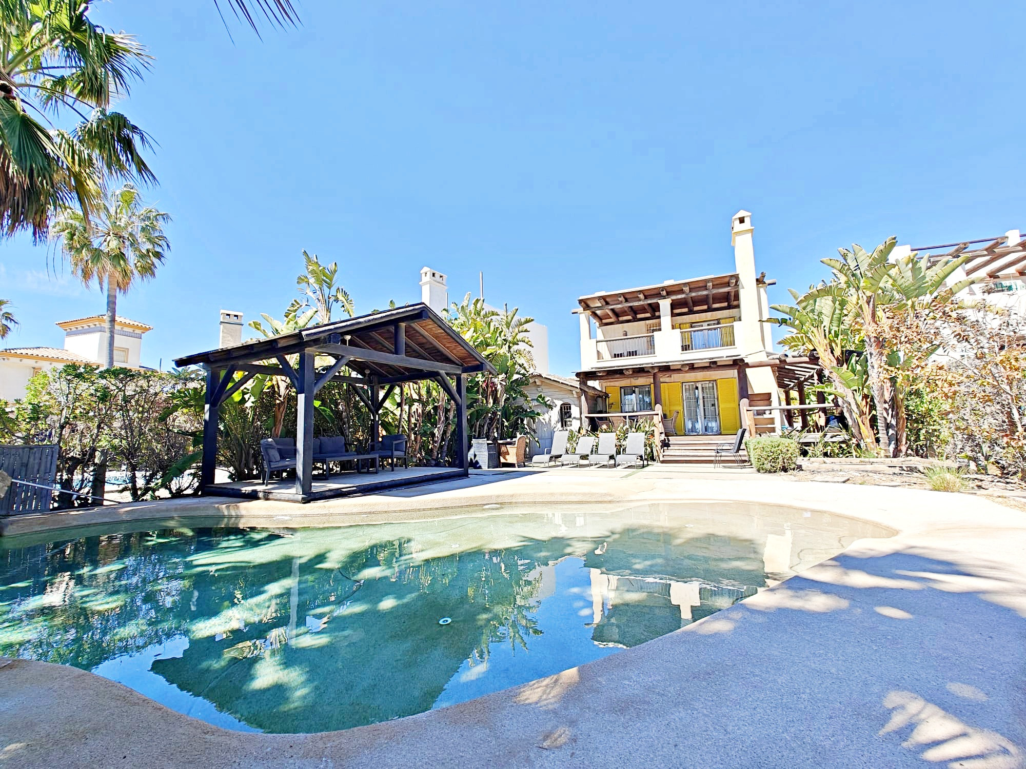 L’aire extérieure de jardin et piscine est clos pour une intimité totale. Pour completer la piscine privée, il y a un hangar avec barbecue et un réfrigérateur.